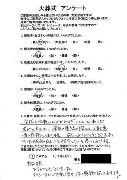 突然の依頼にもかかわらず とてもていねいな式が出来ました。深夜の連絡の際にもご配慮頂き感謝しております。本当にありがとうございました。さいたま在住の知人にも紹介したいと思っております。 半谷様 ありがとうございました。タクシーまでご手配頂き深く感謝致しております。
