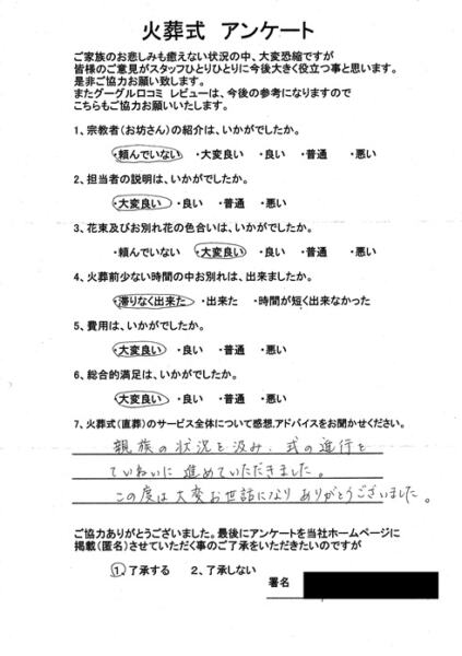 親族の状況を汲み、式の進行のていねいに進めていただきました。この度は大変お世話になり ありがとうございました。